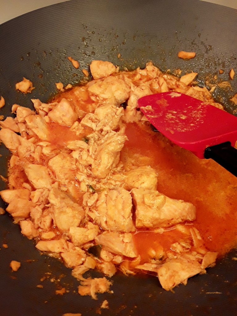 Cook all the ingredients in a wok until salmon is fully cooked and red curry paste is fragrant. Make sure to coat salmon in sauce. Cook top should be at medium high.