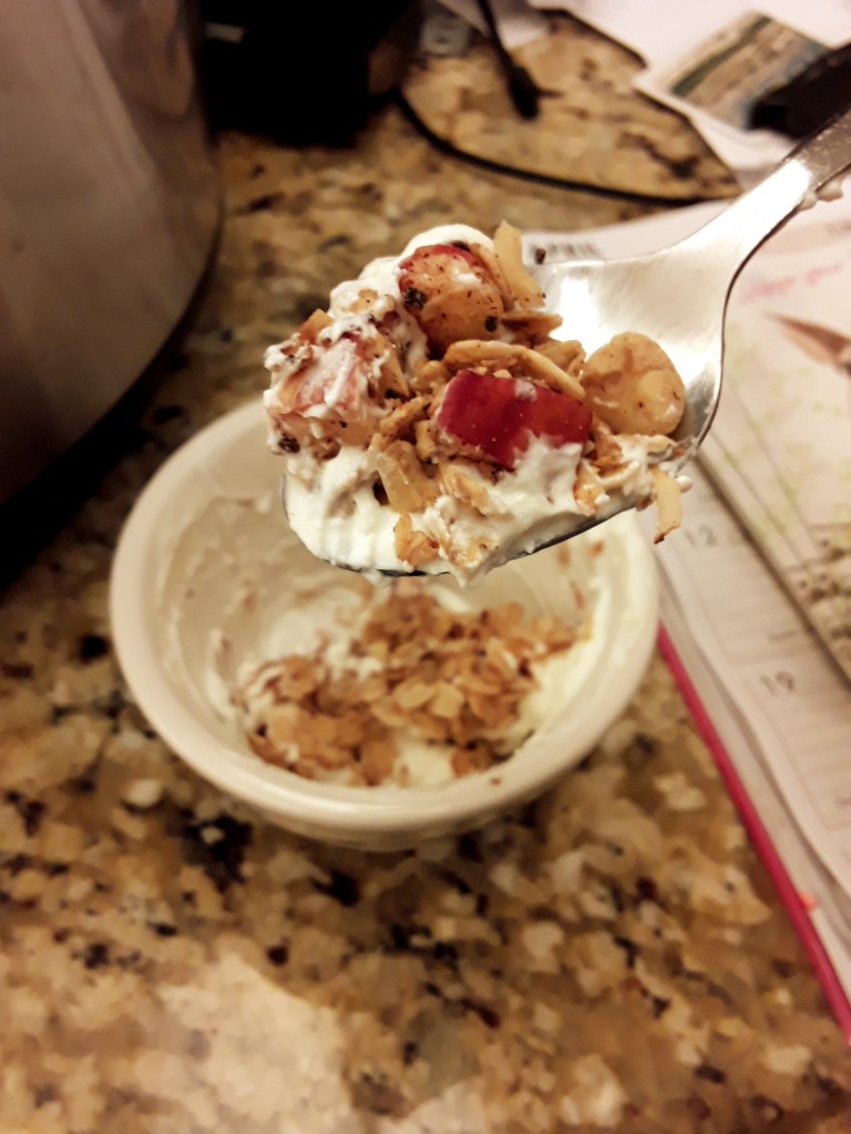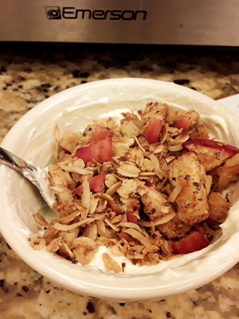 Apple pieces,ground cinnamon,warm toasted oats , sweet raw honey, and super healthy chia seeds make this granola a winner! When your hungry in the morning and a cold bowl of cereal just wont cut it… make this delicious granola to brighten up your morning!