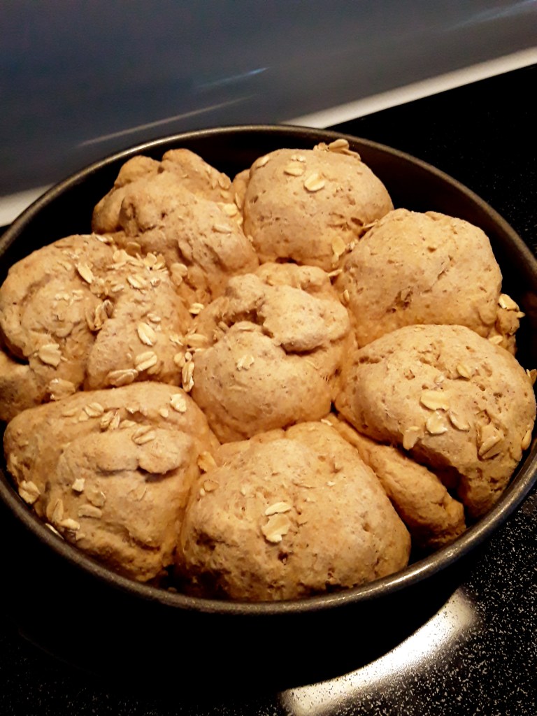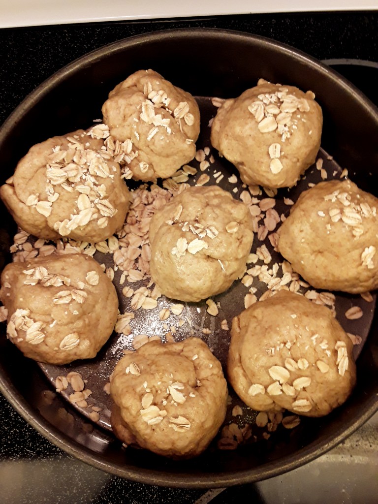 Warm fresh from the oven spelt buns sprinkled with oats and covered with butter and honey! Yummy!!