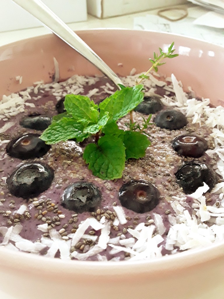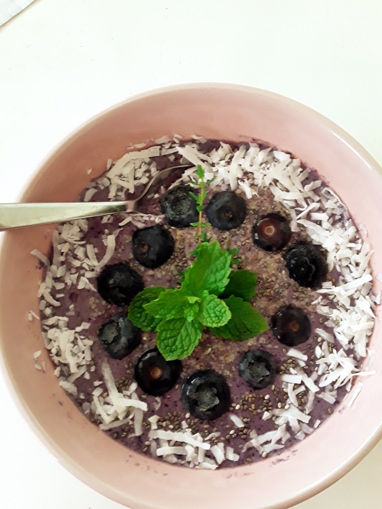 Bluberries,almondmilk,coconut flakes,chia seeds,and a squeeze of lime juice! I love healthy smoothies and when there’s no added sugar you have no worries!