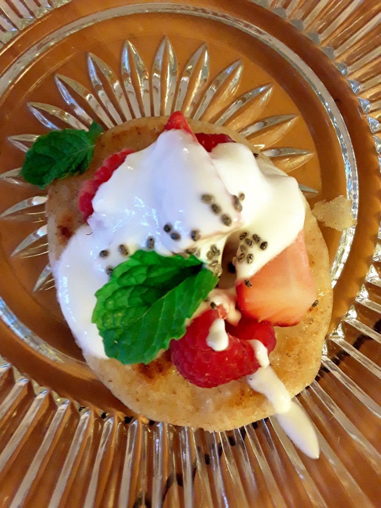 Mini crepes topped with fresh strawberries and raspberries,drizzled with honey yogurt and finally topped with mint and chia seeds!