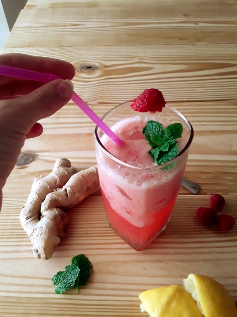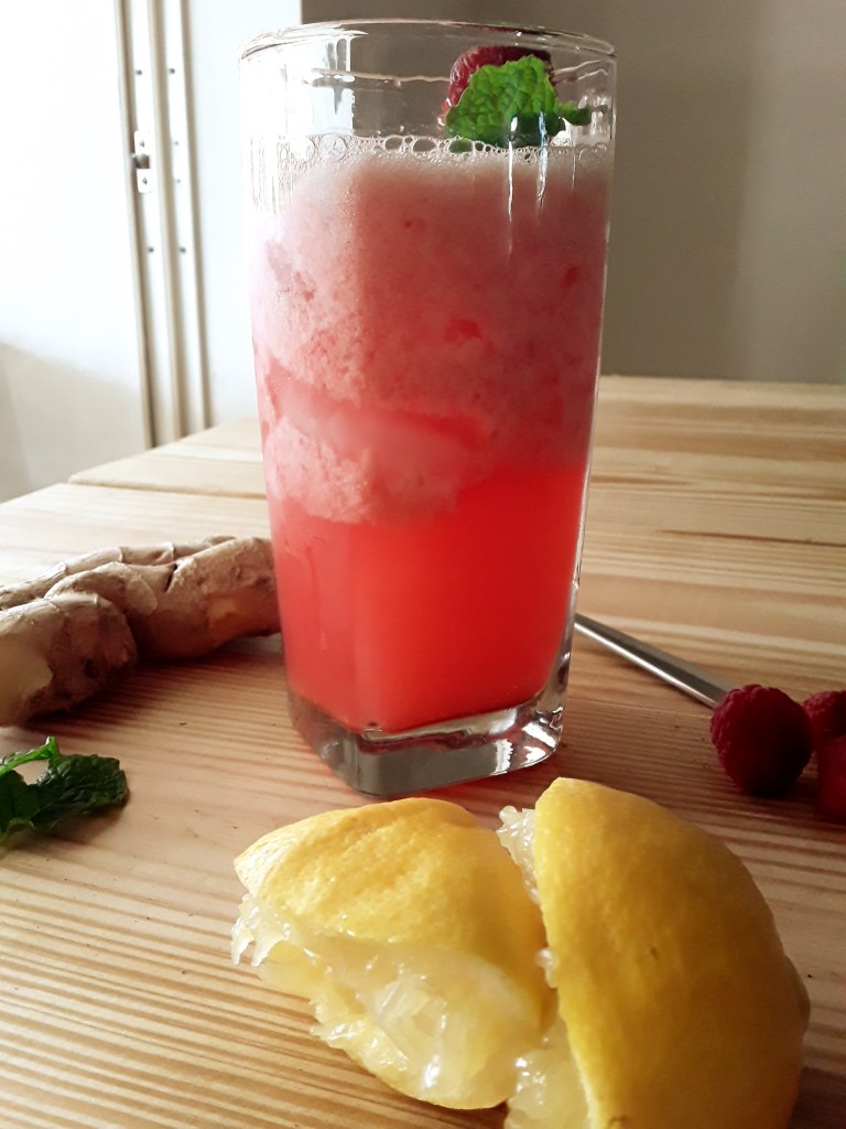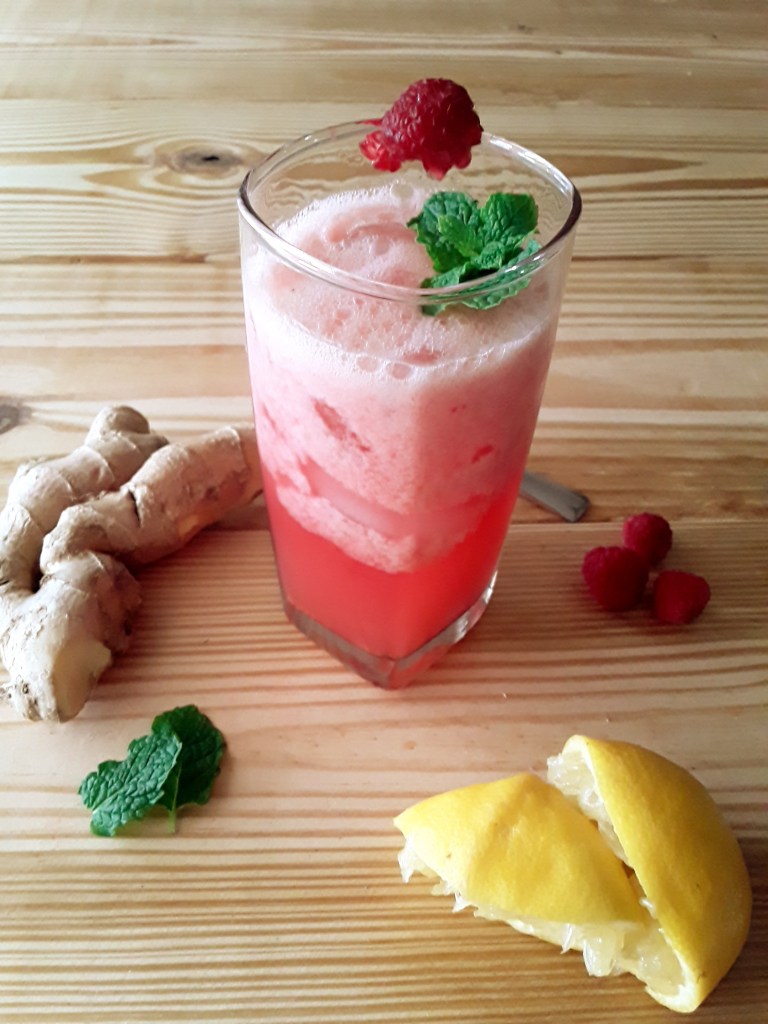Blend the ginger,water,honey,raspberries,and lemon juice in a blender until foamy.