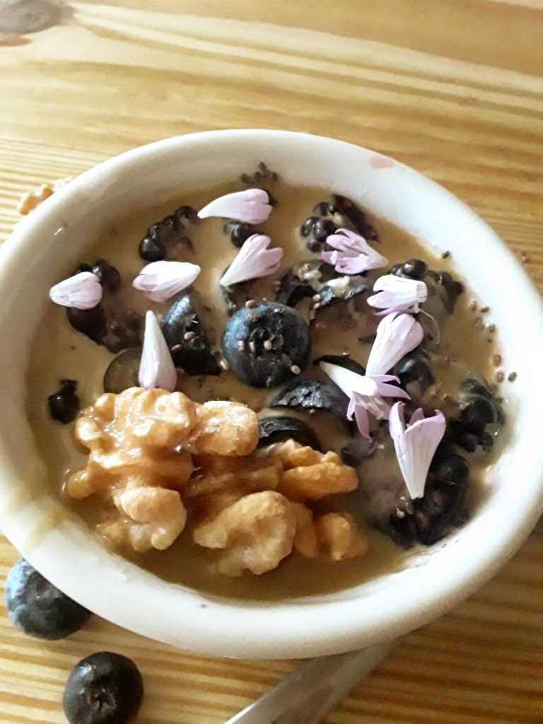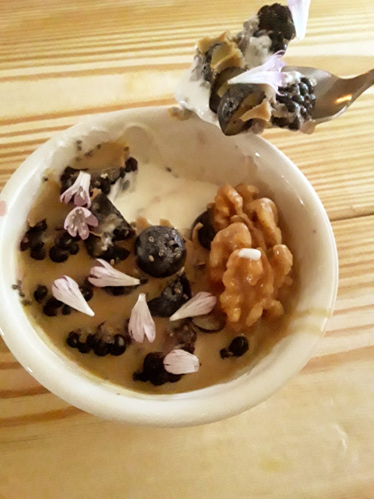 Yogurt topped with chia seeds,blackberries,blueberries,nut butter, and walnuts!