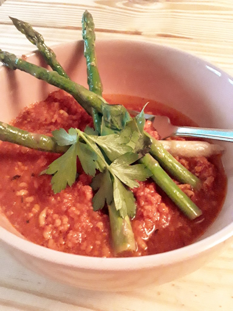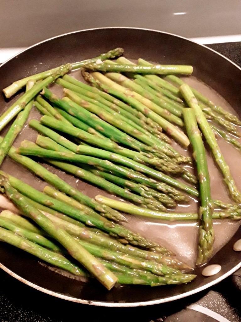 Fresh asparagus sauted in butter and fresh squeezed lemon juice then put atop meat sauce.