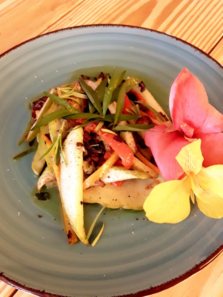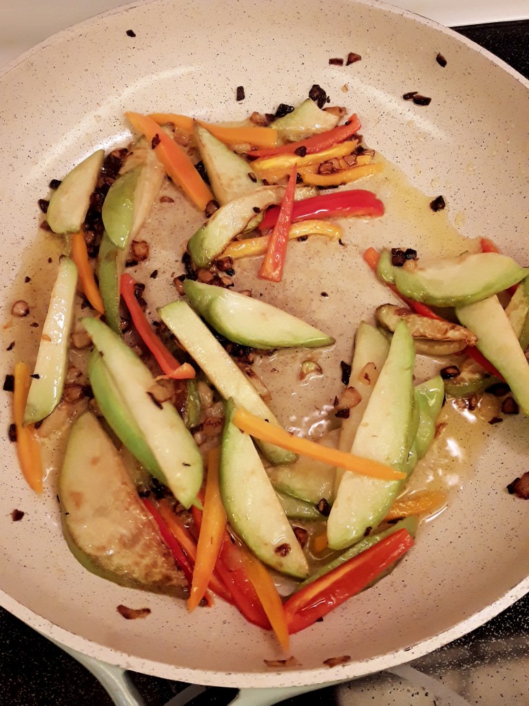 Chayote,sweet peppers,garlic,onion,and olive oil.