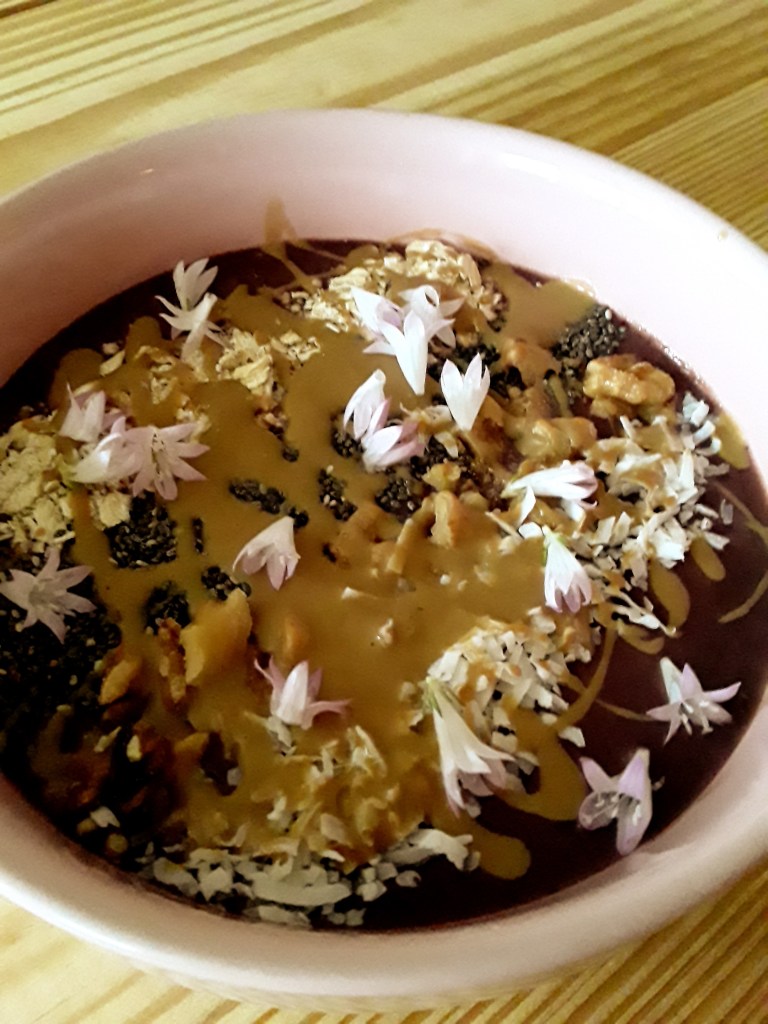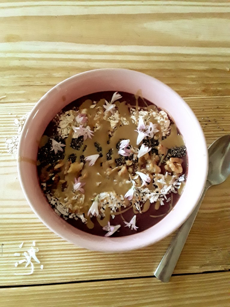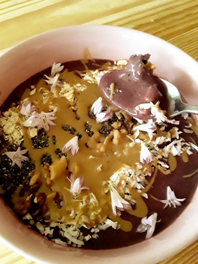 Acai puree,banana,almond milk,mixed berries,and coconut flakes.