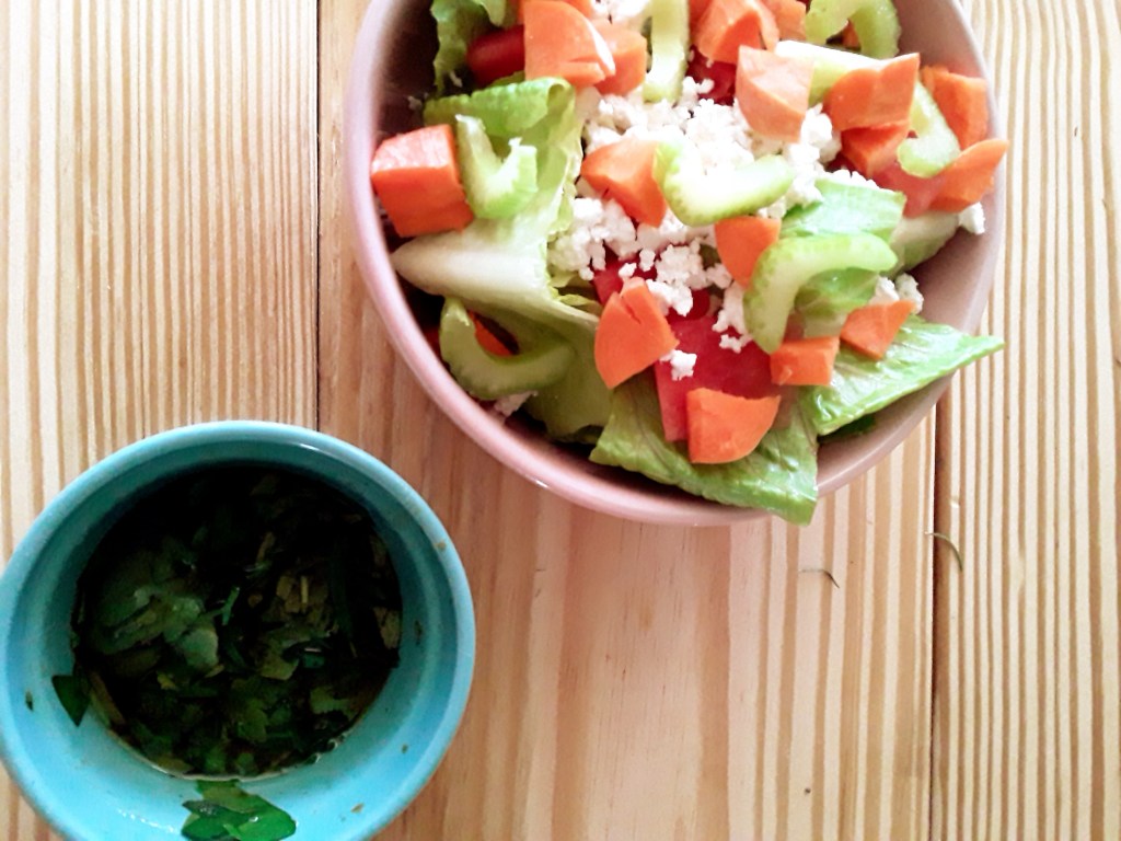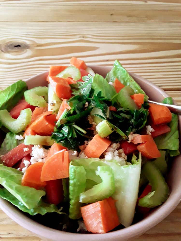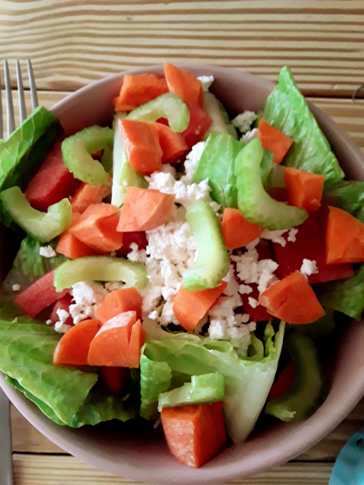 Freshly sliced watermelon,farmer cheese,carrots,and sliced celery drizzled with balsamic dressing.