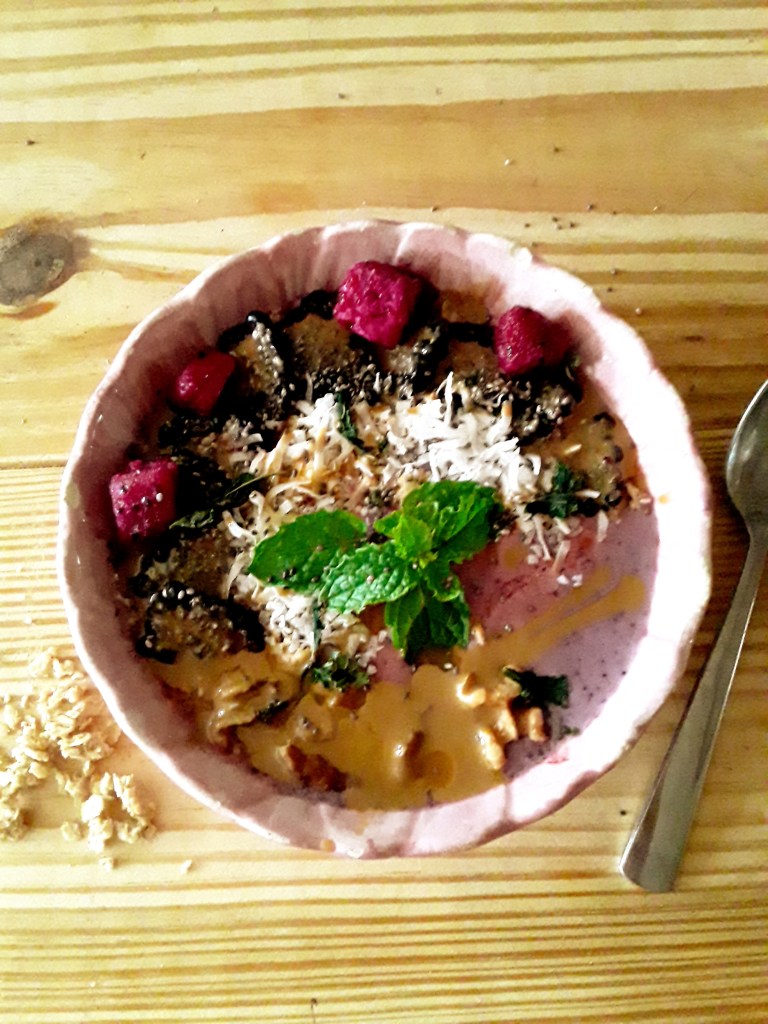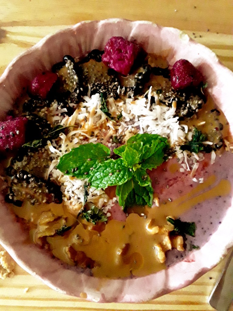 Frozen dragon fruit,raspberries,cabernet grapes,almond milk,banana,coconut flakes,wild blueberries.