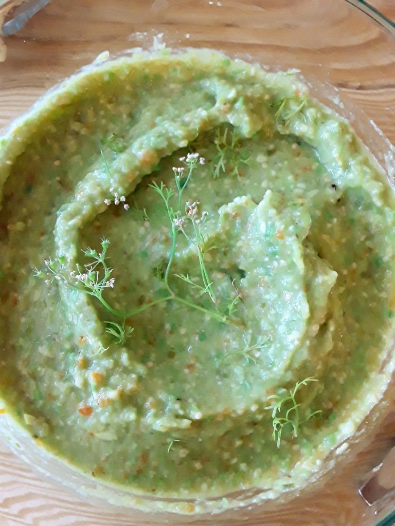 Top with cilantro flowers if desired. Serve with tortilla chips and/or carrot strips.