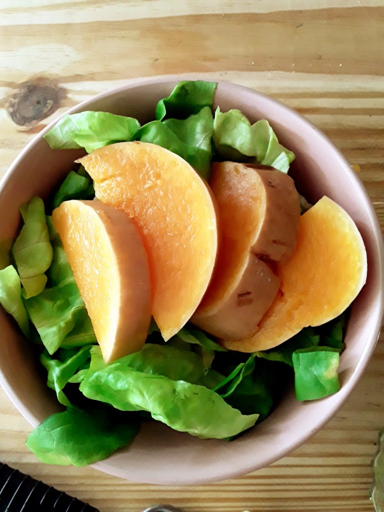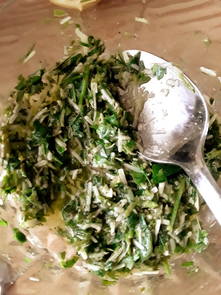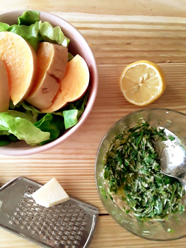 This pesto is simple, but has a lot of different herbs in it. The salad is only two ingredients you cant get much simpler then that!