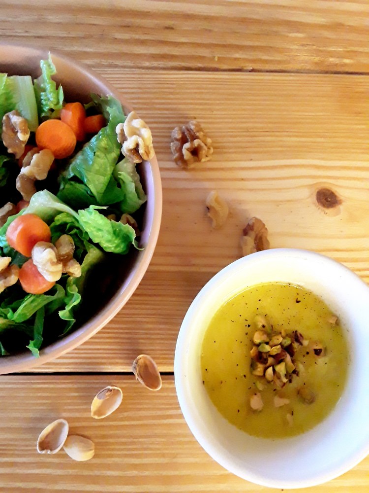 Sweet with a little zing from the rice vinegar and topped with a crunch from the pistachio pieces. This dressing is a refreshing way to eat a salad!