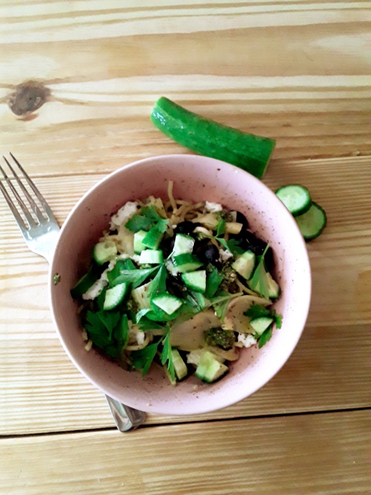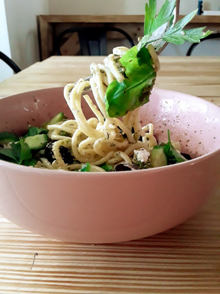 I love quick noodle bowls with fresh ingredients and they must involve some olive oil ( extra virgin olive oil is best!) The black olives are optional or you can use green olives instead.