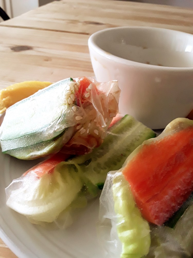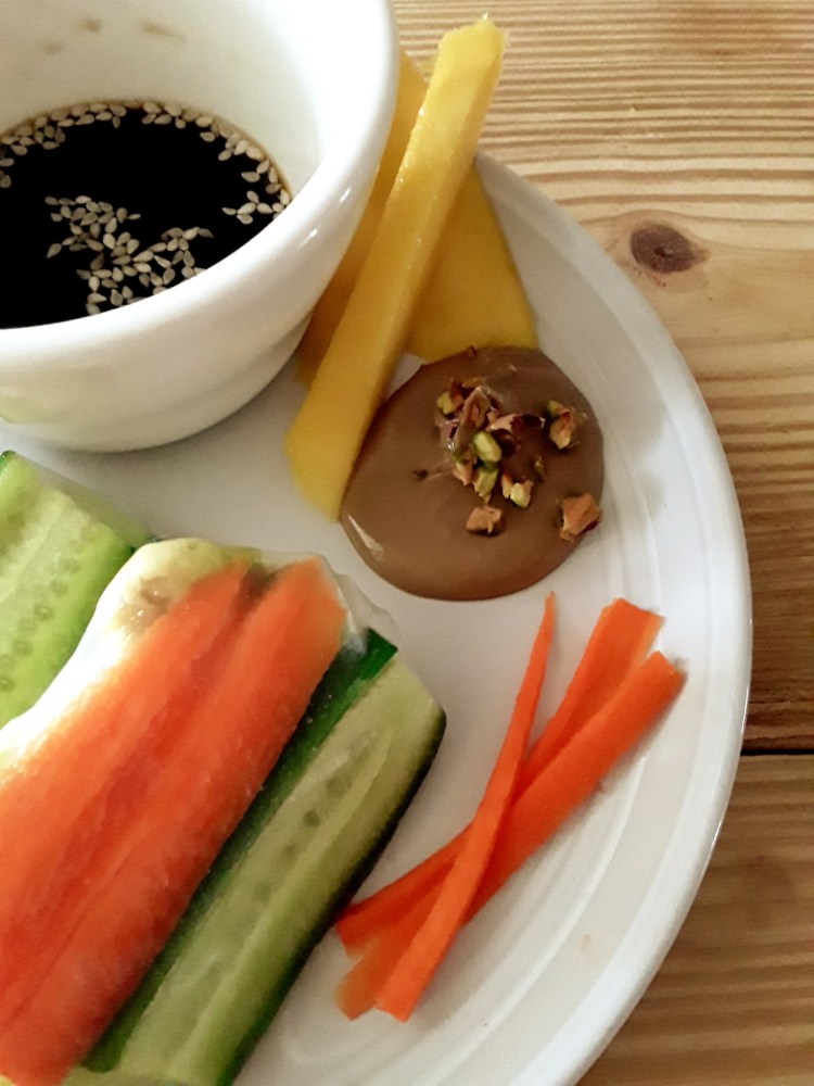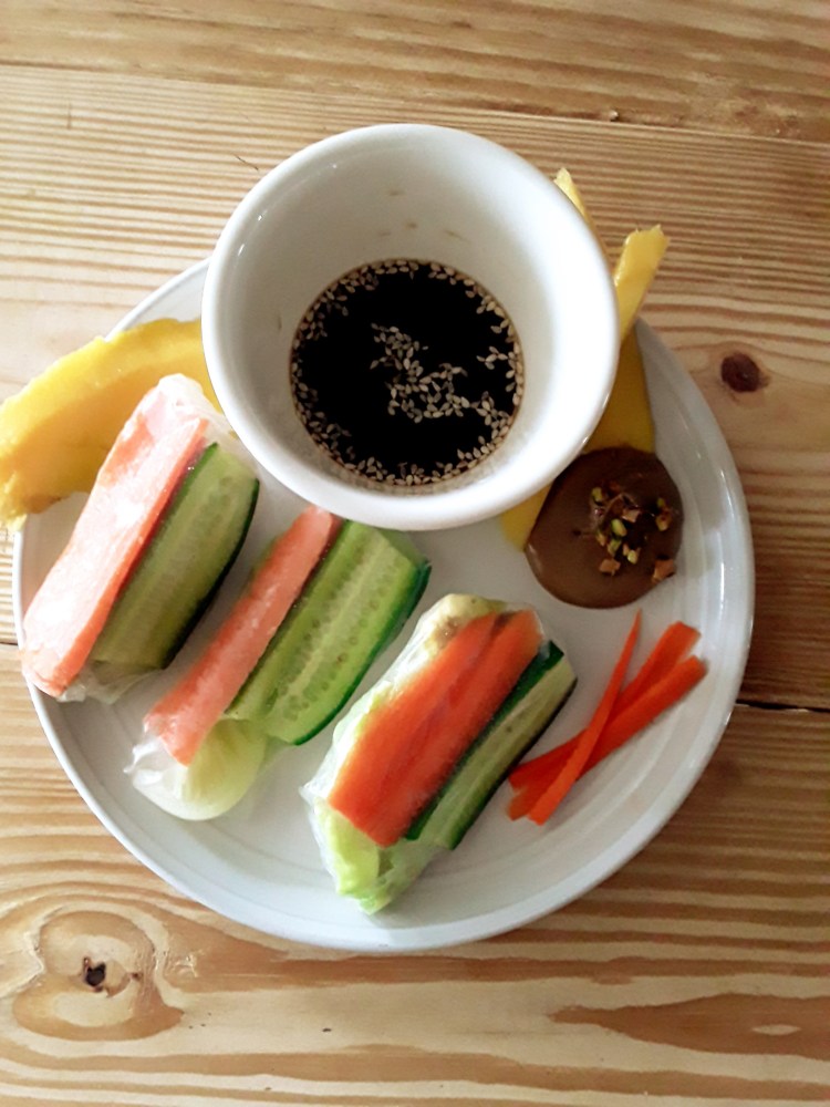Super fresh and full of flavor! These rolls fill your cravings for fresh veggies and just the right amount of sweet mango goodness to treat that sweet tooth!