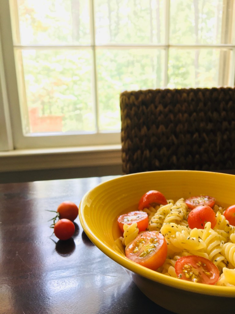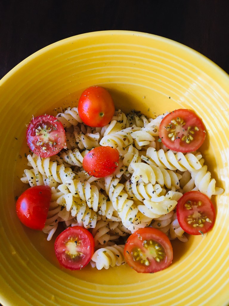 Fresh cherry tomatoes bursting with flavor, sliced, and put atop rotini then tossed with olive oil and herbs.