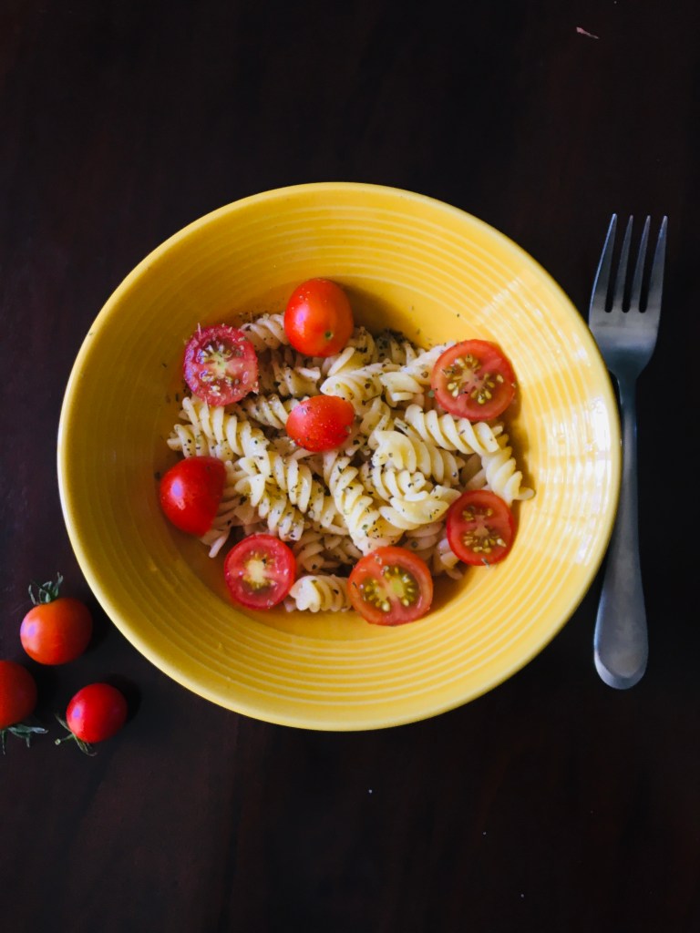 This rotini dish is very simple and uses only five ingredients: cherry tomatoes, cooked rotini, olive oil, herbs, and salt.