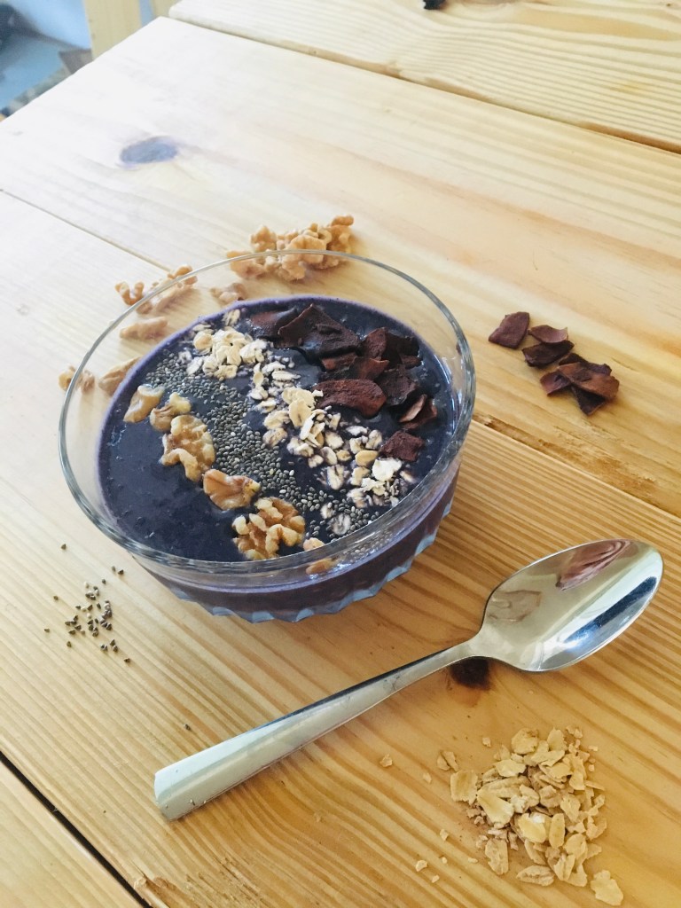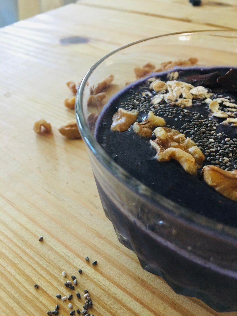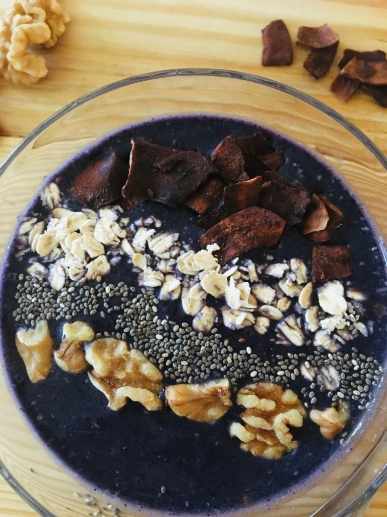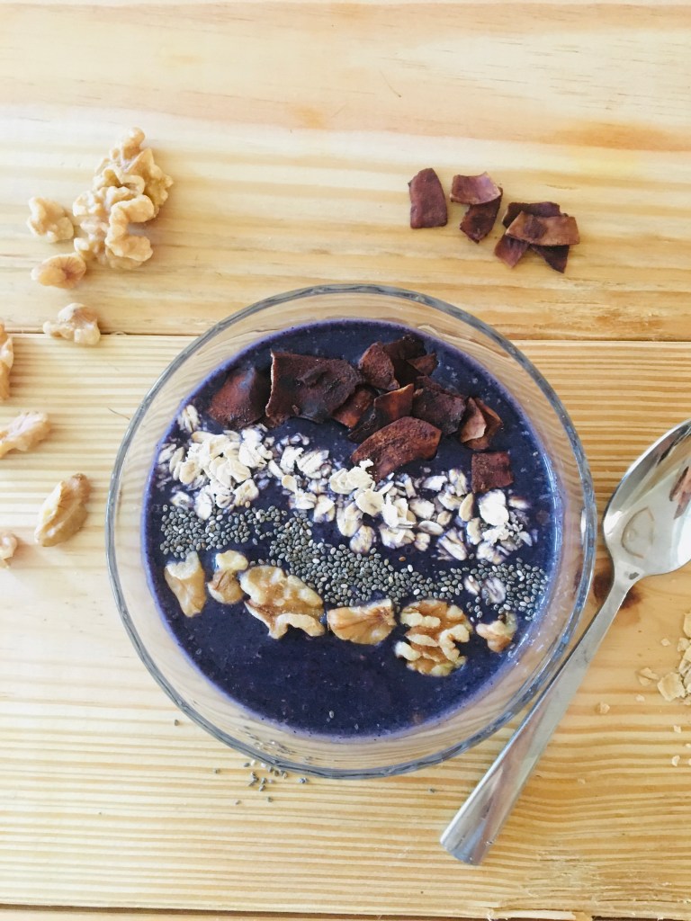 A licious combination of blueberries and banana which I like to call “bluenana”. I topped mine with crunchy cocoa toasted coconut flakes and some healthy walnuts, oats, and chia seeds.