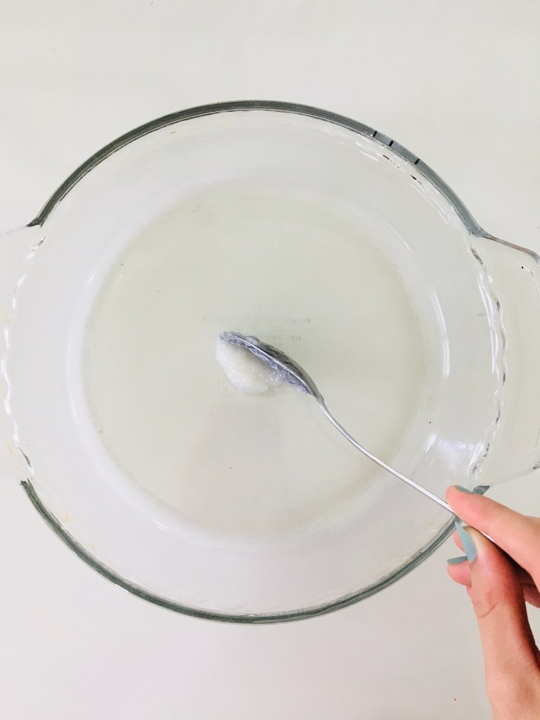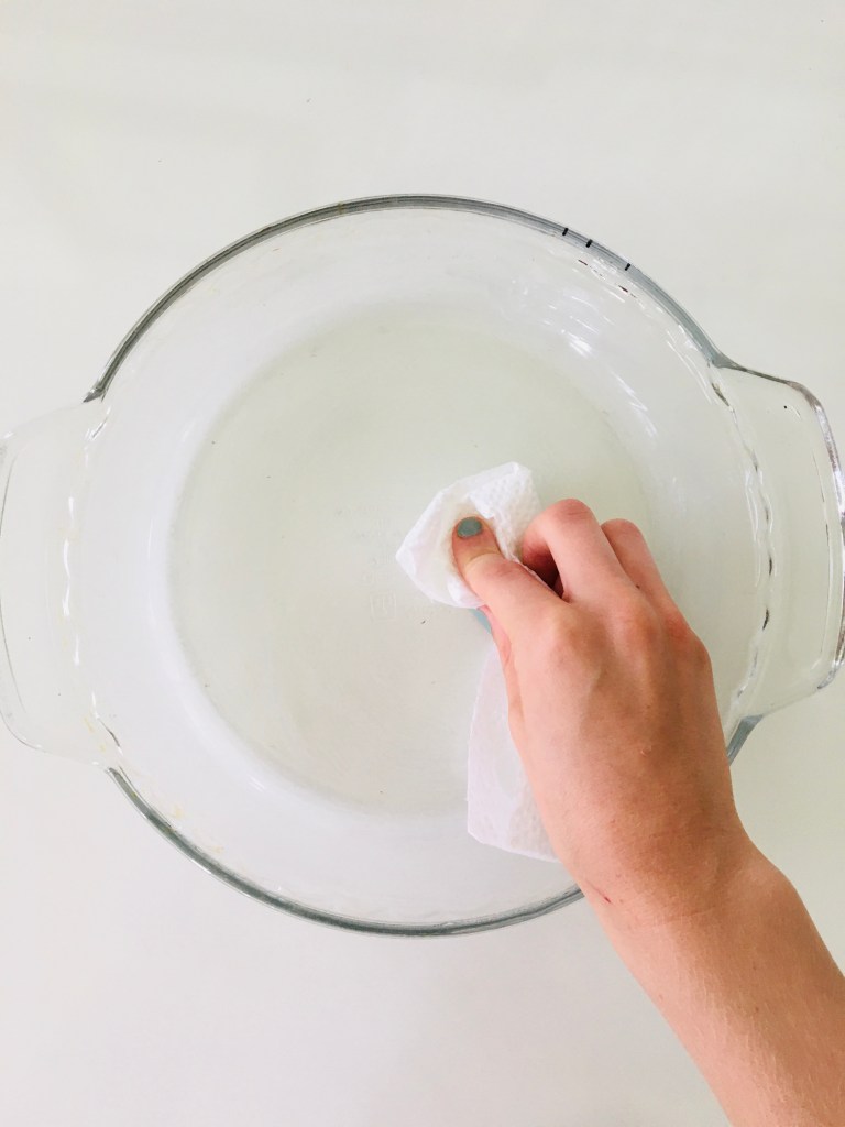 putting coconut oil into the empty pie dish