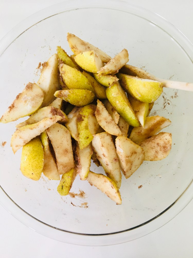 Slice the pears and put all the ingredients into a large bowl.
