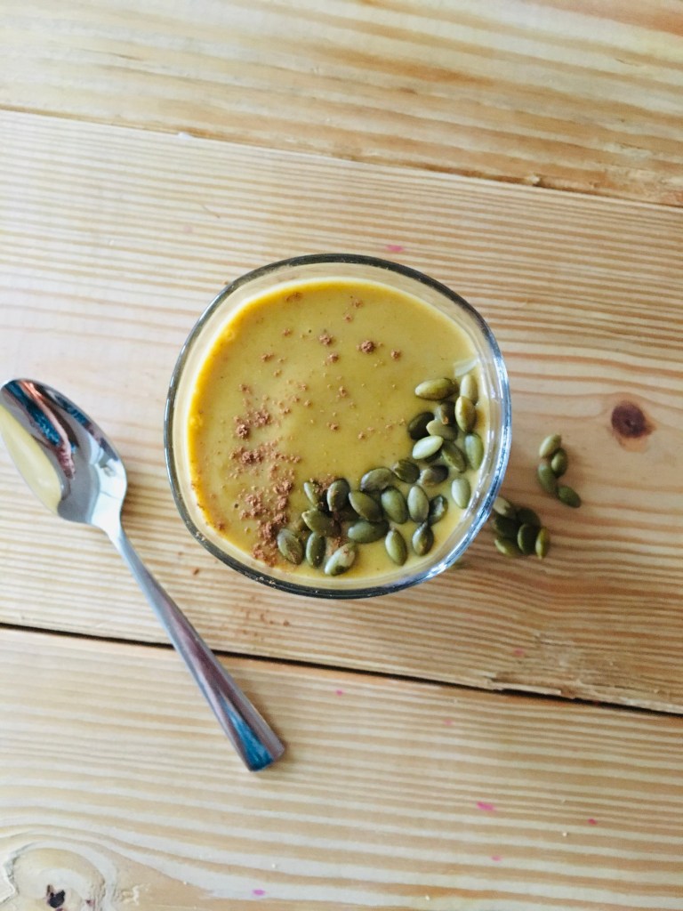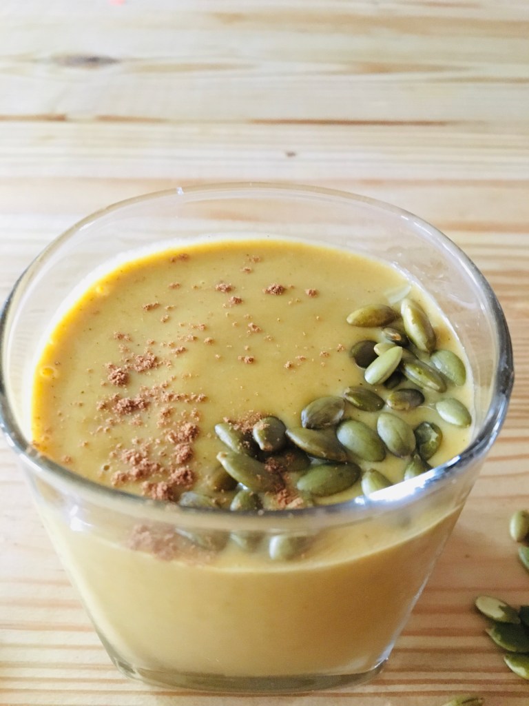 put all the ingredients into a blender and blend until smooth. Pour into 1-2 glasses or cups and garnish with cinnamon and pepitas is desired. Enjoy!