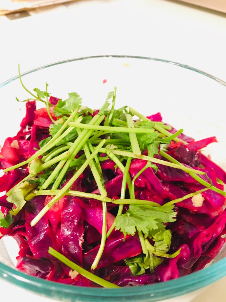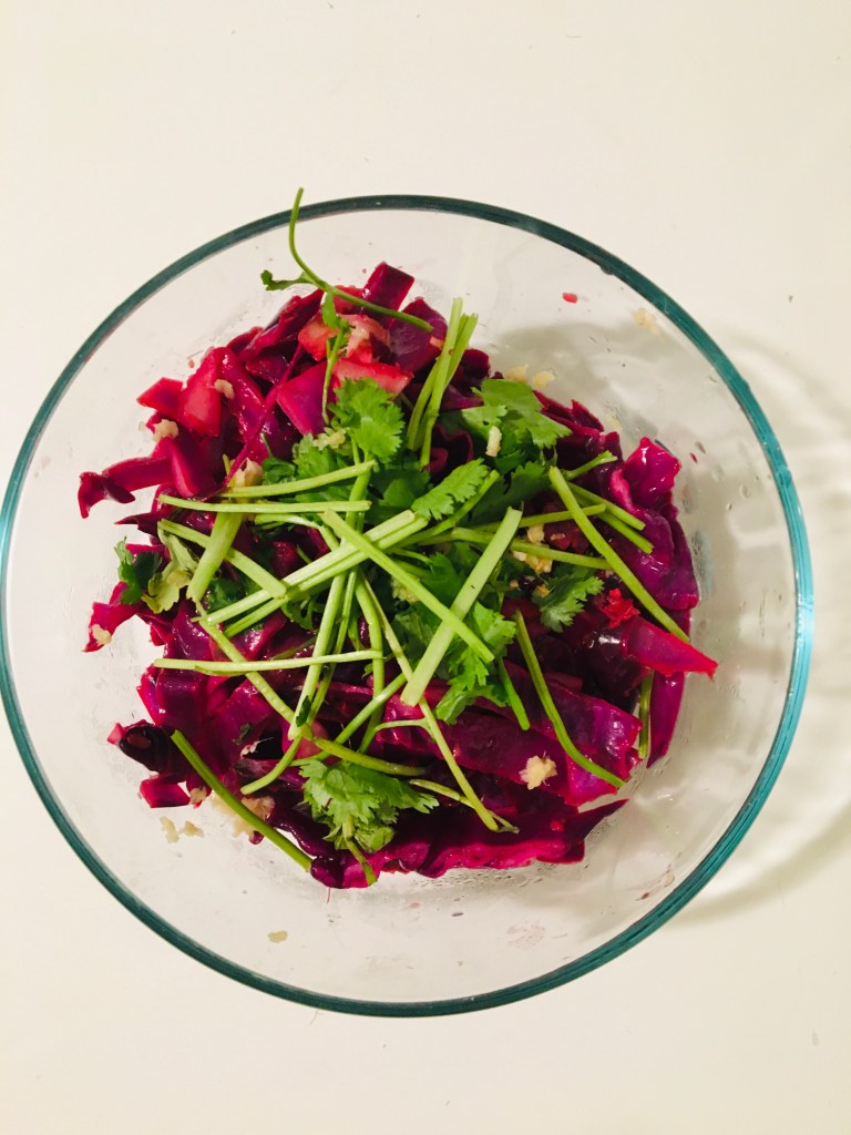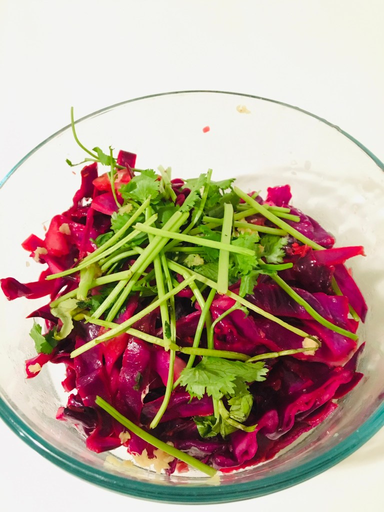 heat the oil and garlic in a pan on medium high. Add the cabbage, ginger, and zest. Cook for 3/5 minutes until tender. Remove from heat and add the lime juice. Top with the cilantro, and additional zest and ginger. Devour…🤫