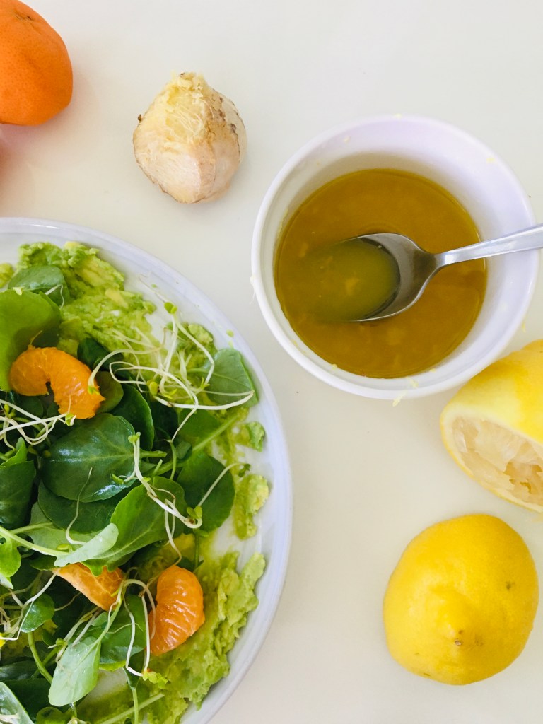the salad. Spread a plate with the mashed avocado. Top with the remaining ingredients. Drizzle with the dressing and enjoy!
