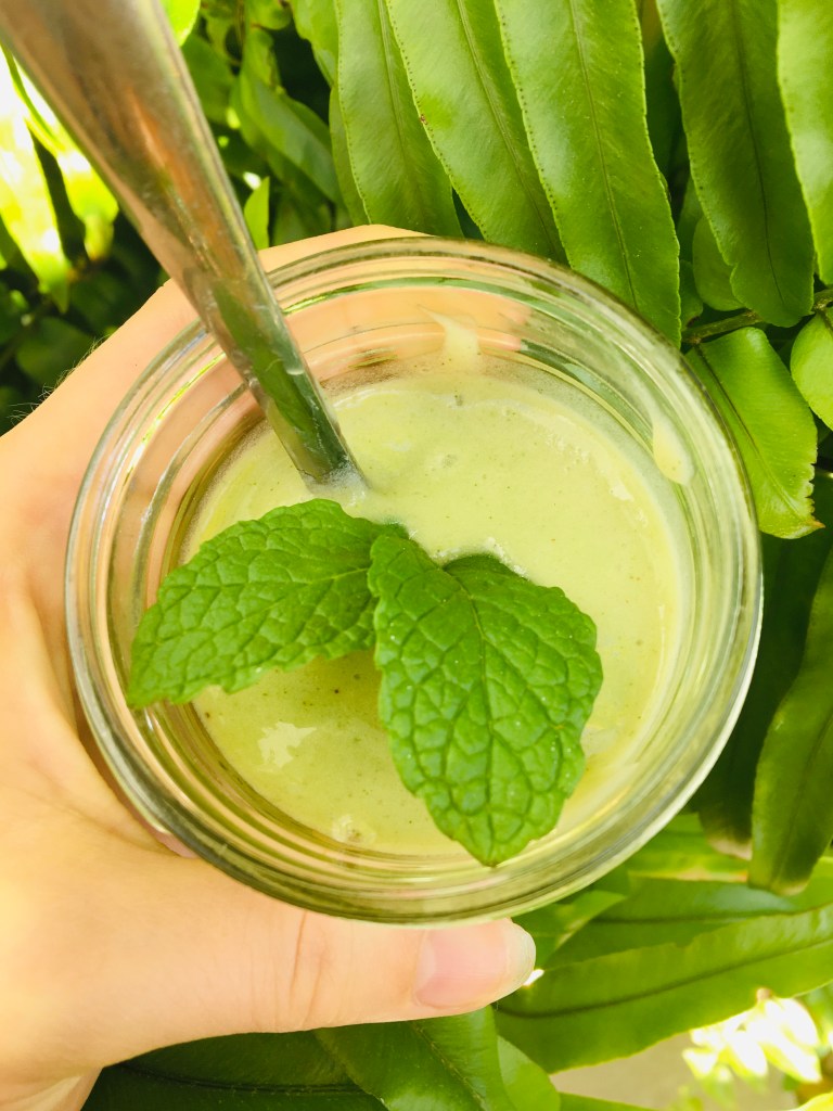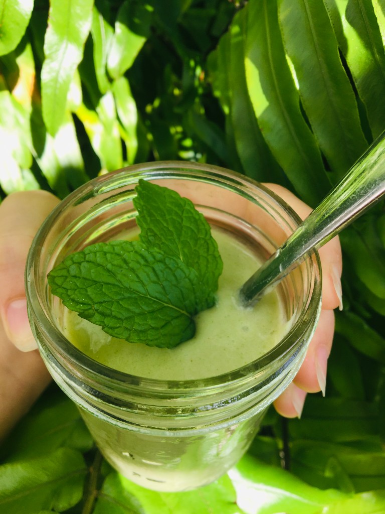 add your ingredients to a blender. Blend until smooth. Top with fresh mint.
