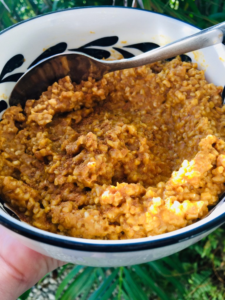 cook oats and plant milk until liquid is absorbed or until oats are soft. stir in the pumpkin, spices, and sweetener. Enjoy!