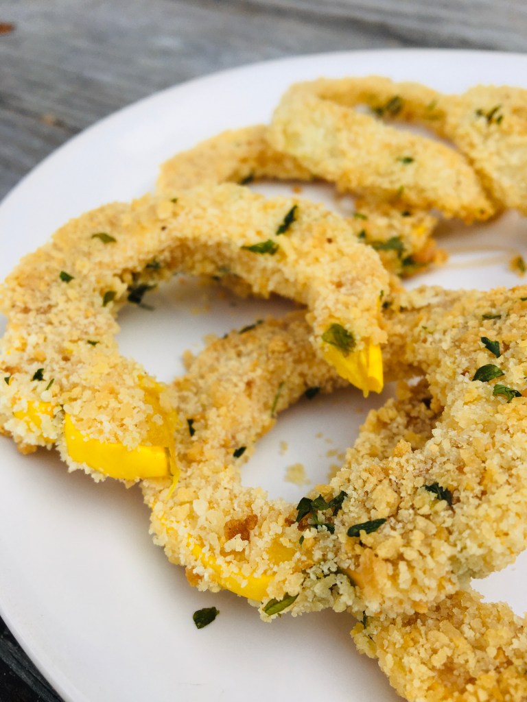 Preheat the oven to 400F. Get out 3 bowls. In bowl one add the flour. I’m bowl two add the vegan mayo, vegan buttermilk, and mustard. In bowl three add the panko bread crumbs and parsley. Set aside the bowls. Now slice the squash into rings and remove the seeds. First dip the rings in the flour and evenly coat. Next dip it in the second bowl with the mayo and buttermilk mixture. Lastly evenly coat it with the Panko breadcrumbs and parsley mixture. Place on a baking sheet and bake at 400F for 10 minutes. Flip over and bake another 10 minutes.