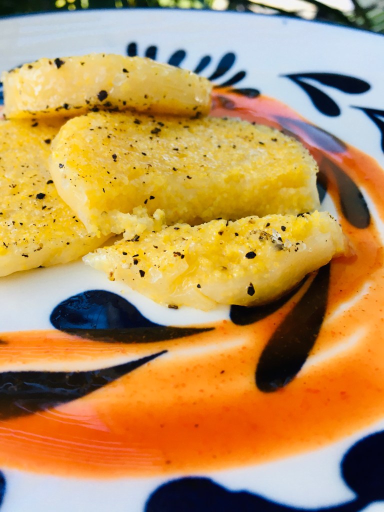 Polenta is delicious with just salt, pepper, and hot sauce! It’s texture is like grits almost and it’s quiet creamy.