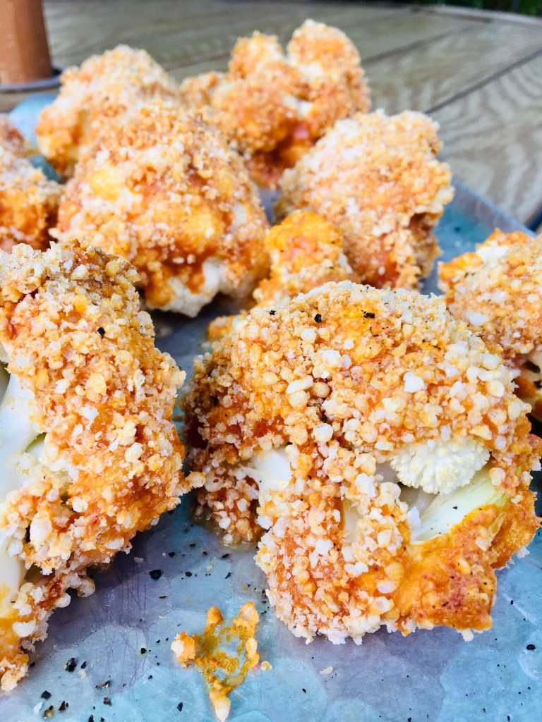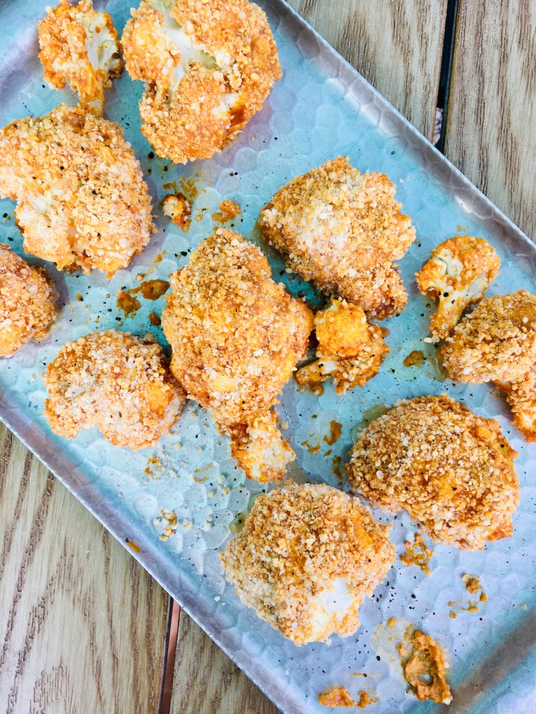 Preheat the oven to 350F. In a bowl combine all the sauce ingredients. Place some breadcrumbs in a bowl and set aside. dip the cauliflower florets into the sauce then roll in the bread crumbs. Place on a greased baking sheet and bake for 30-35 minutes until crisp.