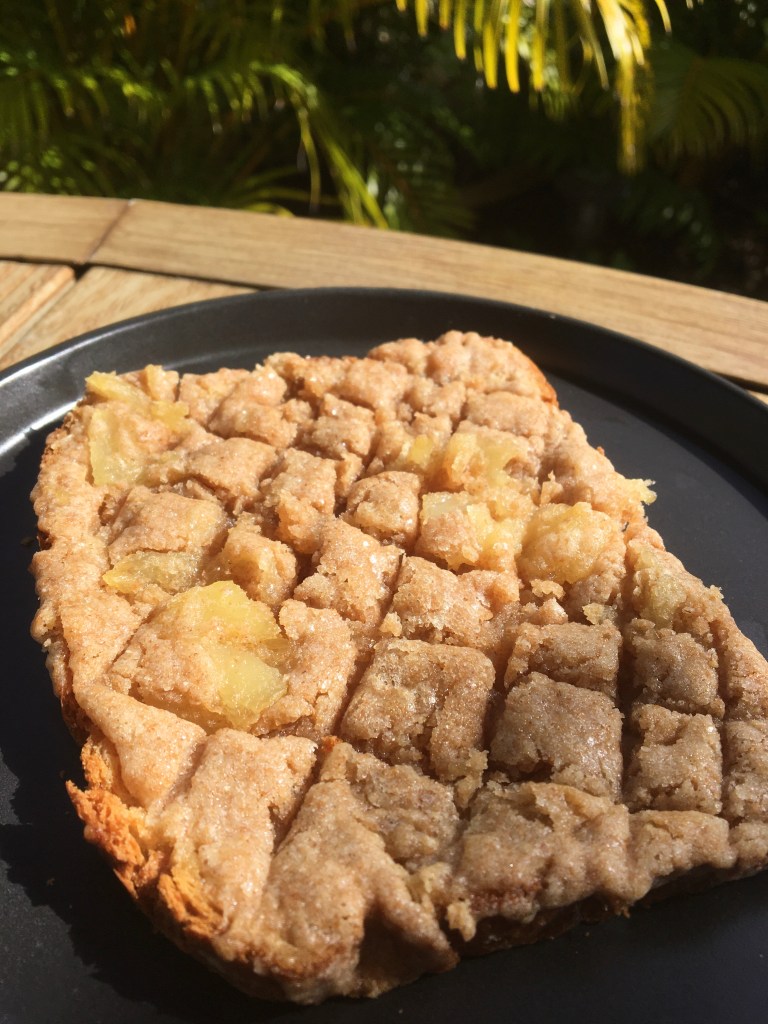 Preheat the oven to 350F. In a bowl combine the flour, sugar, butter, and pineapple until fluffy. Spread the mixture onto the bread and bake for 15-20 minutes. After baking use a butter knife to make a pattern in just to top layer of the bread (as shown in the image above).
