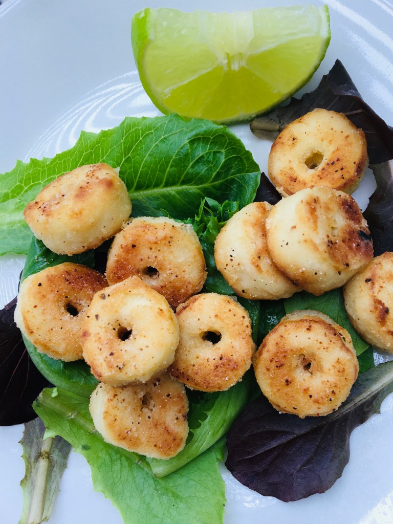 Use a straw to poke holes in the middle of each palm heart slice. Set aside and in a small bowl combine the flour, rice flour, garlic powder, salt, and pepper. Roll the palm heart slices in the flour and heat a pan to medium high with oil. Fry until golden brown on both sides. Enjoy!