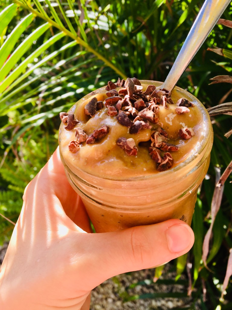 Combine in a blender until smooth. Top with cacoa nibs and enjoy!