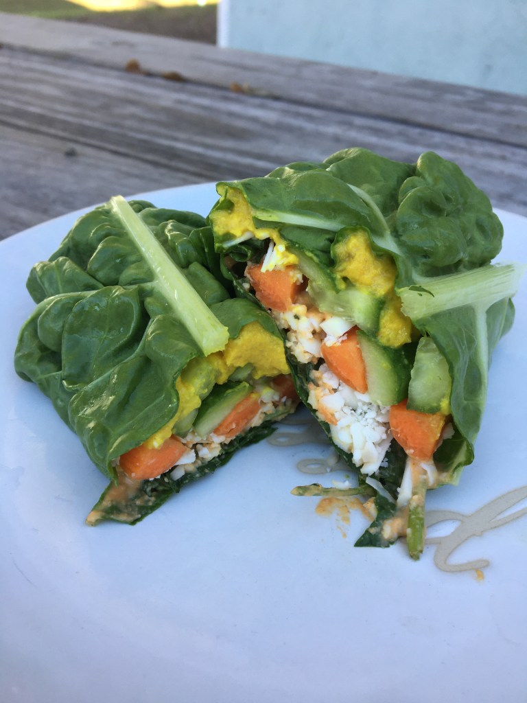 Fill the chard with all the ingredients like you would a tortilla. Fold in the sides and roll up. Cut in half and enjoy!
