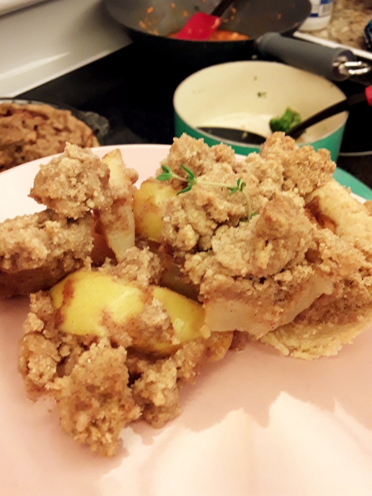 fresh pears coated in cinnamon and sugar then covered in crumble top crust and baked to perfection! Delicous!